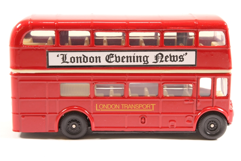 Routemaster d/deck bus in "London Transport" red livery with "London Evening News" advert