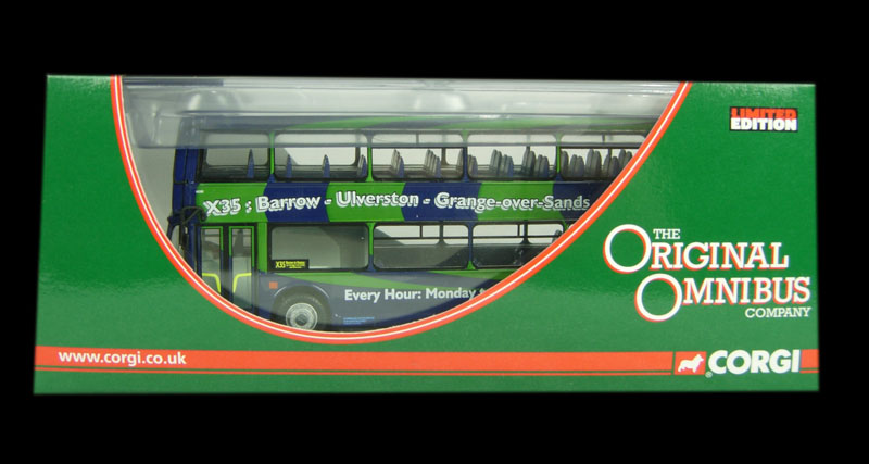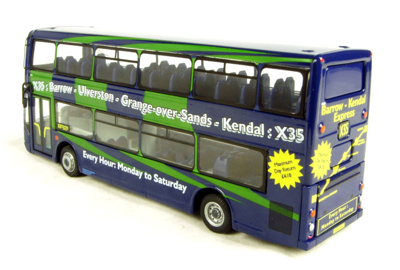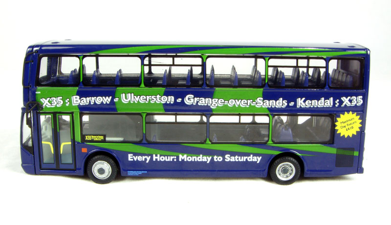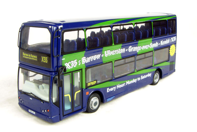 The model represents one of three double decker buses purchased by Cumbria County Council from East Lancs using Rural Bus Challenge. The buses operate on the prestigious hourly X35 service between Barrow-in GÇô Furness and Kendal via Grange-over-Sands. The buses entered service on 1st March 2006 and feature high specification seating with a moquette that reflects that this scenic route runs GÇÿbetween the mountains and the seaGÇÖ. The service is operated by Stagecoach North West under contract to the County Council and the buses carry that companyGÇÖs legal lettering and are numbered 18278-80 in that companyGÇÖs scheme.