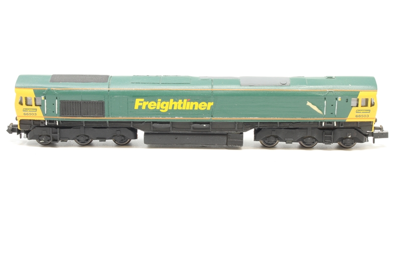 Class 66 66503 in Freightliner livery - resin body on unknown chassis - one axle missing gears - paint chip on one side